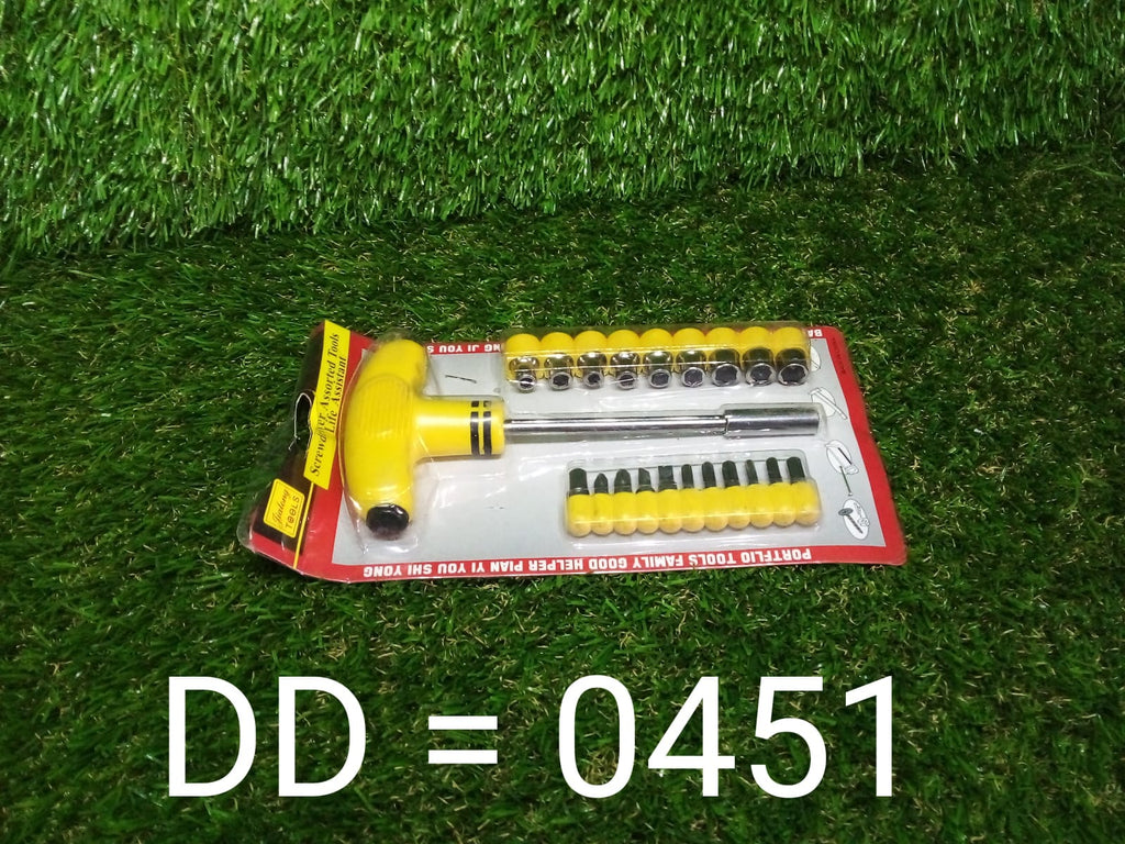• One T Screwdriver Handle 9 Sockets (Sizes: 4 mm - 12 mm) 11 Screwdriver Bits (Sizes: 3 mm 8 mm) which comprise : 3 flat(-)type screwdriver bits 3 Philips screwdriver bits(+) type 5 Torx screwdriver bits (Flower type) Professional Tool kit : Ideal for professional, home, Car & Office use Compact tool that can use for Screws & nuts both Also