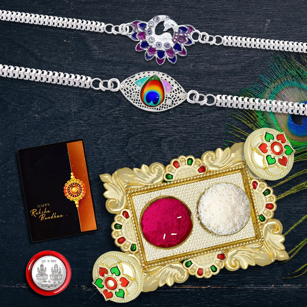 Celebrate the pure bond of love and protection this Raksha Bandhan with our thoughtfully curated Rakhi Combo Gift Set. This complete set includes a beautiful Rakhi, a traditional roli-chawal pack for the tilak ceremony, a shiny coin symbolizing prosperity, a festive greeting card, and a sweet chocolate treat — everything you need for a perfect celebration.