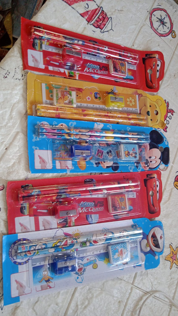 - stationery gift set - This gift pack makes for a perfect return gift choice for kids This set includes pencil, ruler, sharpener, Crayon eraser and a Compass Box. The stationery items come packed in an attractive packing that will appeal the kids instantly.